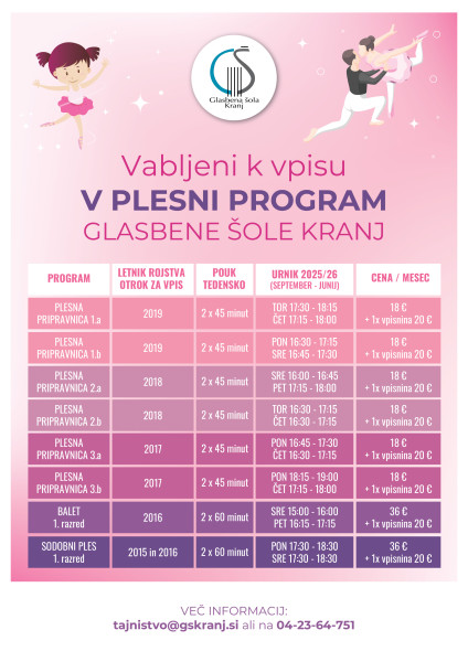 Vabljeni k vpisu v PLESNI PROGRAM Glasbene šole Kranj